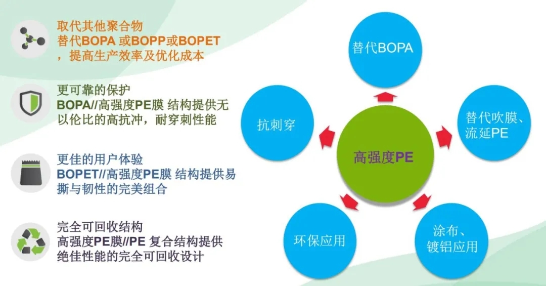 高強度PE膜,相比較傳統(tǒng)的PE吹膜或CPE膜,在提升機械強度的同時,能實現(xiàn)材料輕量化,兼具優(yōu)異的光學(xué)性能、材料柔韌性,耐撕裂穿刺、耐揉折及熱封合牢固等優(yōu)點。